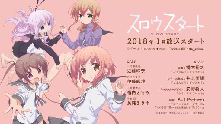 Sebagaimana telah diberitakan sebelumnya, Slow Start, komik karya Yuiko Tokumi ini akan diadaptasi menjadi anime. Rencananya anime ini akan dirilis di Jepang pada pada Januari 2018 mendatang.