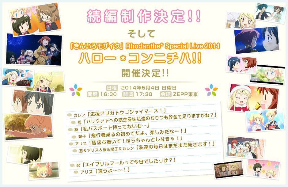 Selain adaptasi musim kedua, juga diumumkan konser bertema Kin-iro Mosaic berjudul “Hello Konnichiwa” yang akan dibawakan oleh grup Rhodante, pada 4 Mei mendatang di Zepp Tokyo. Tiket konser ini akan mulai dijual pada 21 Maret.