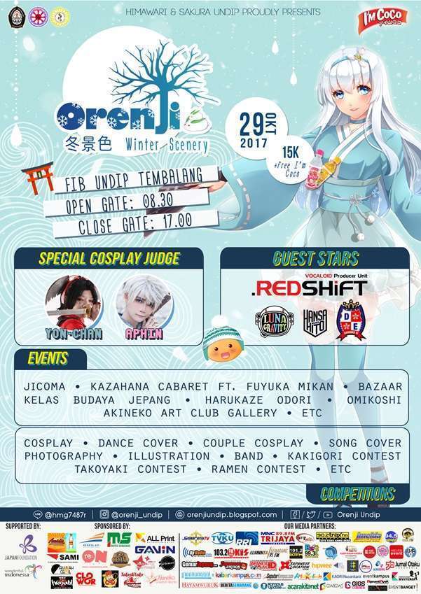 ORENJI (Original Event of Japan in Indonesia) Adalah sebuah festival budaya jepang atau lebih sering dikenal dengan 文化祭 (bunkasai) atau Jfest yang diselenggarakan dengan tema yang berbeda-beda setiap tahunnya, tahun ini ORENJI 2017 bertemakan “Fuyu Geshiki”.