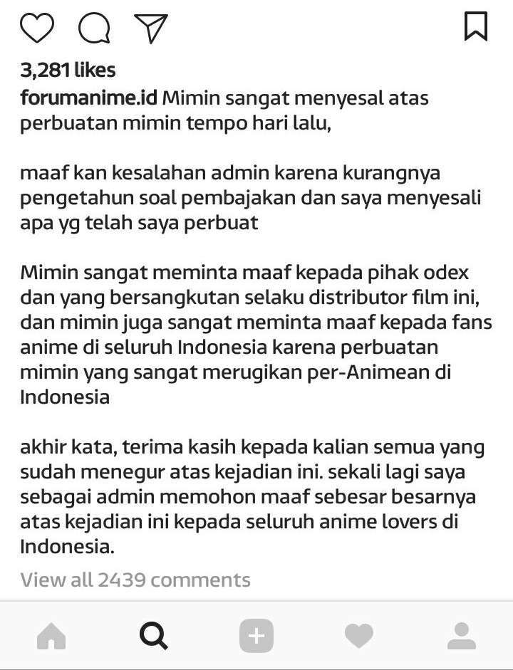 Terakhir, akhirnya sebuah pernyataan resmi disampaikan pihak forumanime.id oleh salah satu pengurus yang mengaku dalang dari kejadian yang merugikan ini lewat post di Instagram mereka. Dalam post ini, pelaku mengaku kurang mengetahui tentang pembajakan sebelumnya. Ia juga menyesali perbuatannya tersebut dan meminta maaf kepada pihak distributor, maupun khalayak publik yang turut merasakan akibatnya.