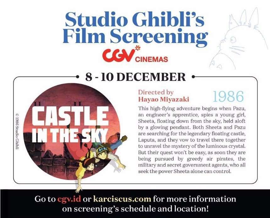 Jaringan bioskop CGV Cinemas Indonesia akan memutar film asal Jepang karya Hayao Miyazaki, Laputa: Castle in the Sky (Tenkū no Shiro Rapyuta). Rencananya film ini akan mulai diputar mulai 8 sampai 10 Desember 2017 mendatang.