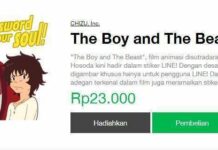 Stiker dari film animasi karya Mamoru Hosoda, The Boy and The Beast ini dapat dibeli di aplikasi Line di Indonesia seharga Rp23.000.