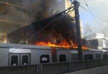 Bangunan yang terbakar menyambar KRL Odakyu yang lewat di dekatnya.